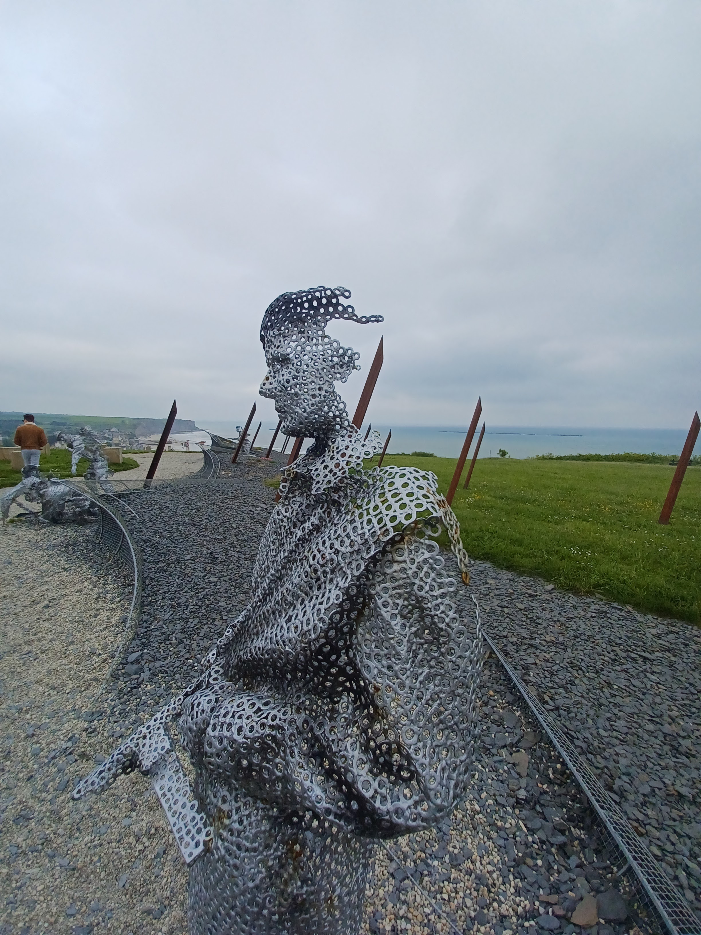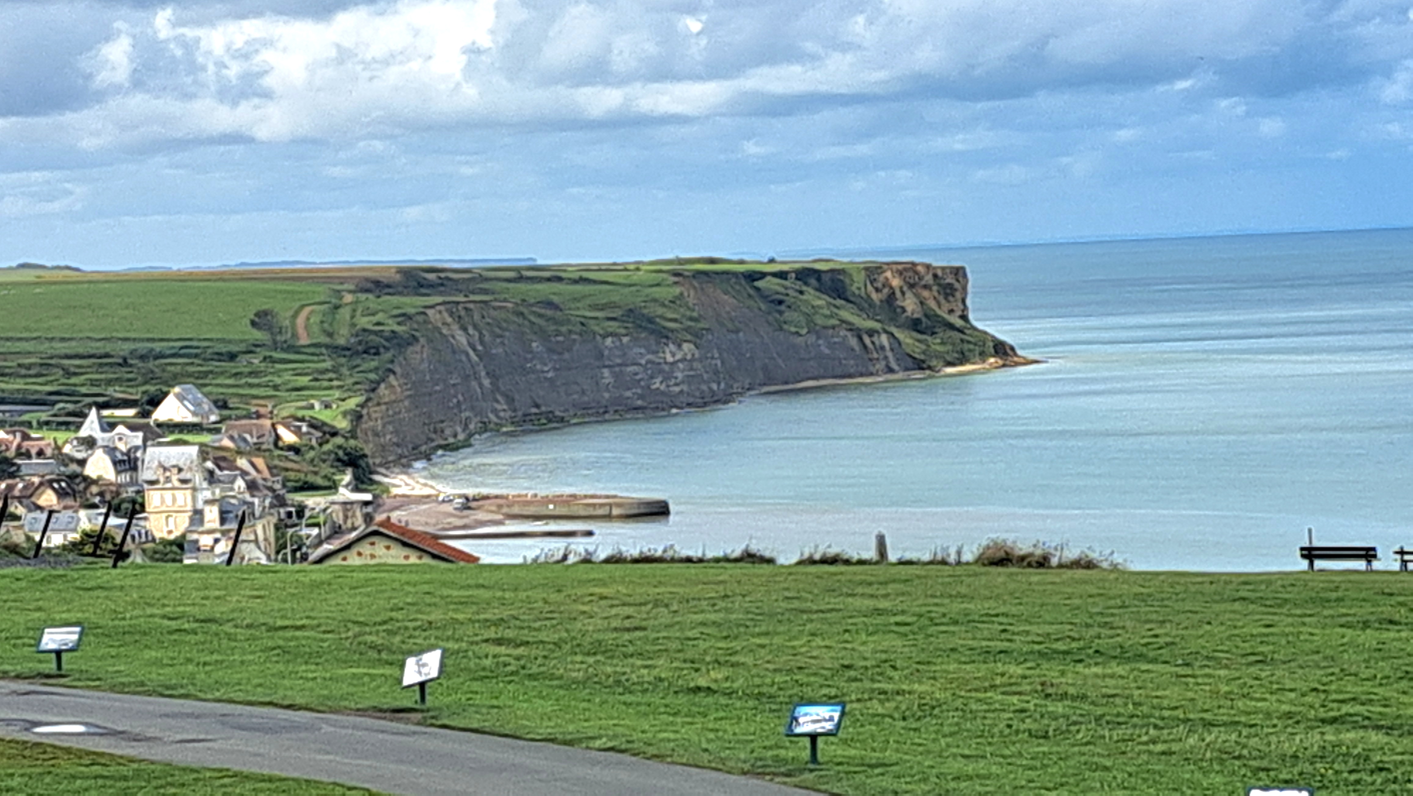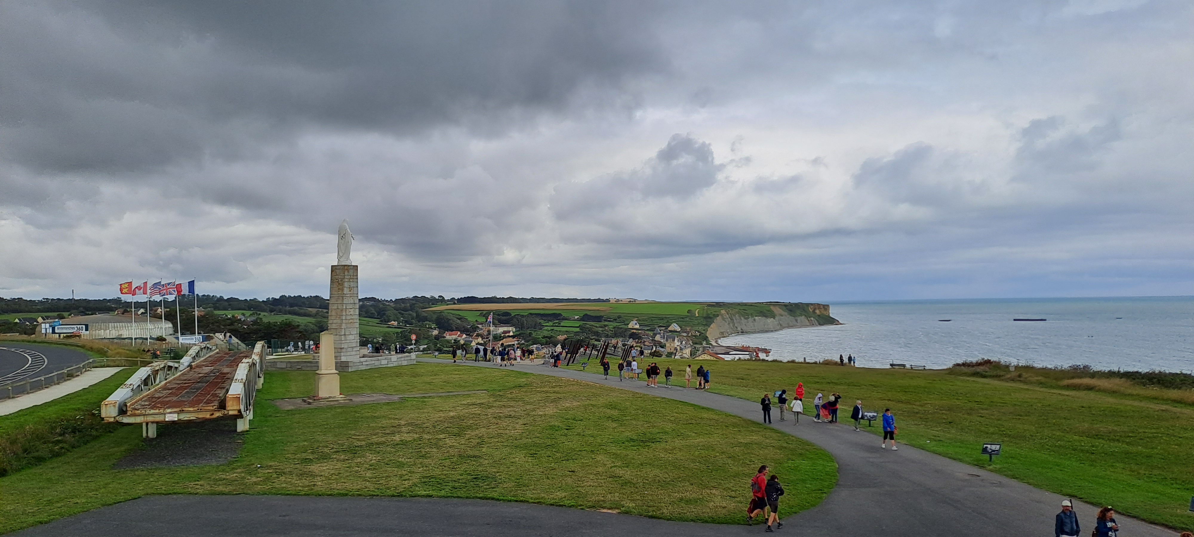 Une falaise avec une vue magnifique sur Arromanches en contre-bas. Le cinéma diffuse un film en 360°, avec des images d’archives du débarquement. Je recommande, en complément du mémorial de Caen 👍🏻